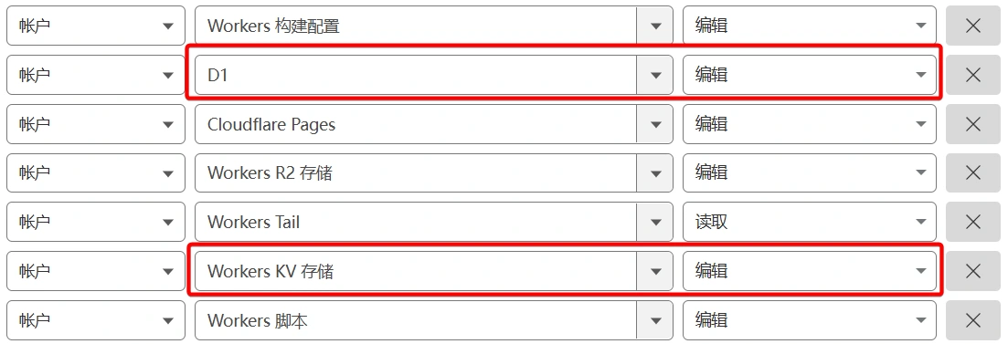 选择编辑Worker的模板,然后给它再添加编辑D1和编辑KV的权限,再创建api令牌,回到github页面添加为CLOUDFLARE_API_TOKEN。